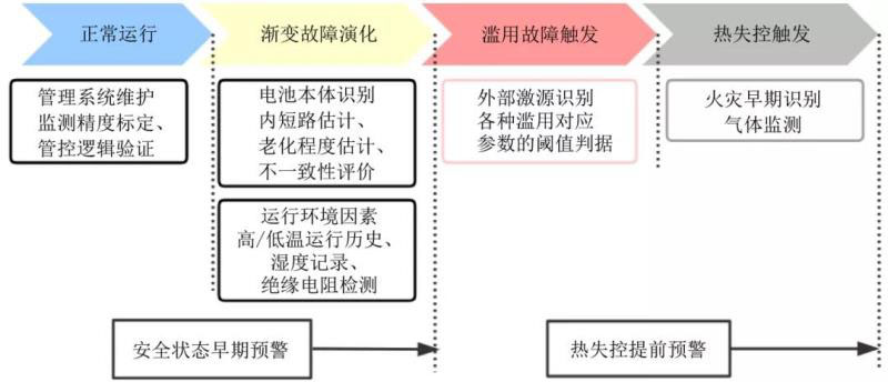 結合韓國儲能電站事故分析,電池本體因素及運行環(huán)境因素逐漸演化是引起儲能電站事故的根本誘因。鑒于該類因素的長周期演化特性,我們將鋰電池儲能系統(tǒng)安全性評估劃分為兩個層次。一是安全狀態(tài)早期預警,二是熱失控的提前預警,如圖4所示。