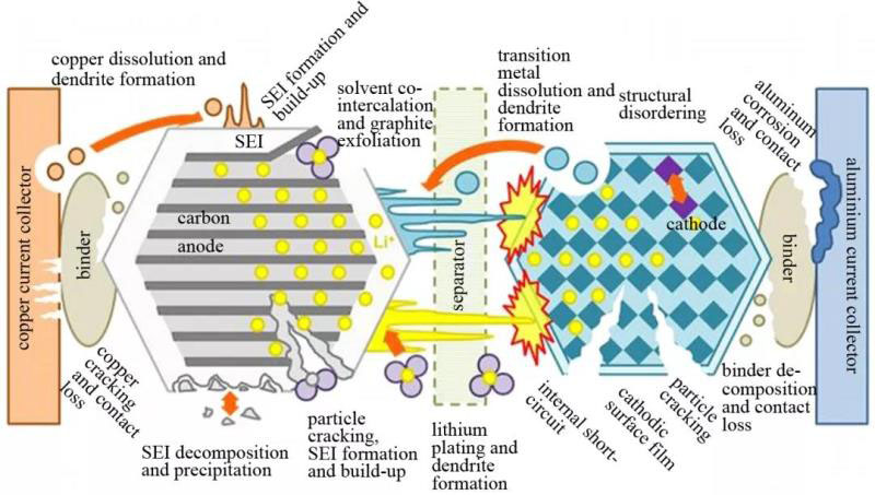 圖3揭示了鋰離子電池老化過程所有可能經歷的內部變化。電池的首次充電過程使負極(一般為嵌鋰碳)和電解質發(fā)生電化學反應,生成SEI膜;在電池的后續(xù)循環(huán)過程中,電化學寄生副反應使SEI沉積并變厚,電極材料的不斷膨脹與收縮導致新的活性位點暴露出來,在快速充放電或電極活性物質分布不均勻的情況下,活性物質(模型中一般簡化為顆粒)容易發(fā)生粉化、碎裂、脫落或結構錯位;與此同時,如果電池長期在高于其額定電流的電流密度下快速充電或低溫下充電,其負極表面容易形成金屬鋰枝晶。金屬鋰用作電池負極時,也容易產生枝晶,若這兩種枝狀晶體逐漸生長,容易刺穿隔膜,引起電池內部的短路。此外,當電池過放電時(1~2 V),負極的集流體銅箔開始溶解,在電極上析出形成銅枝晶,易造成電池短路,同樣,正極集流體鋁的表面氧化膜長時間與電解質相互作用可能發(fā)生溶解,使得鋁箔被電解質腐蝕。