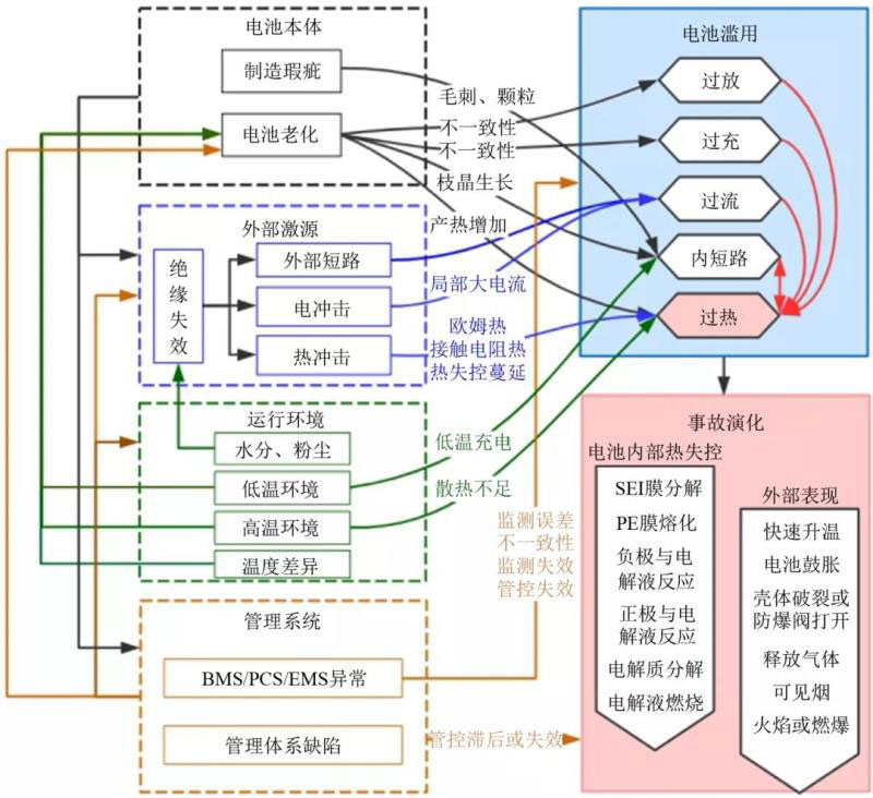 在相關事故的調研及驗證性測試中,調查團隊將儲能電站事故致因總結為以下四個方面:電池系統(tǒng)缺陷、應對電氣故障的保護系統(tǒng)不周、運營環(huán)境管理不足、儲能系統(tǒng)綜合管理體系欠缺。其中,電池內部及成組問題、外部電氣故障、電池保護裝置(直流接觸器爆炸)、水分/粉塵/鹽水等造成的接觸電阻增大及絕緣性能下降等問題將可能直接誘發(fā)電池熱失控。而電池管理系統(tǒng)(battery management systems,BMS)、儲能變流器(power conversion systems,PCS)、能量管理系統(tǒng)(energy management systems,EMS)之間信息共享不完備或不及時,PCS和電池之間的保護配置與協(xié)調不當、PCS故障修理后電池的異常、測量裝置及管理系統(tǒng)之間發(fā)生沖突等系統(tǒng)管理問題,則可能使故障不能及時有效地得到管控而演化為事故。