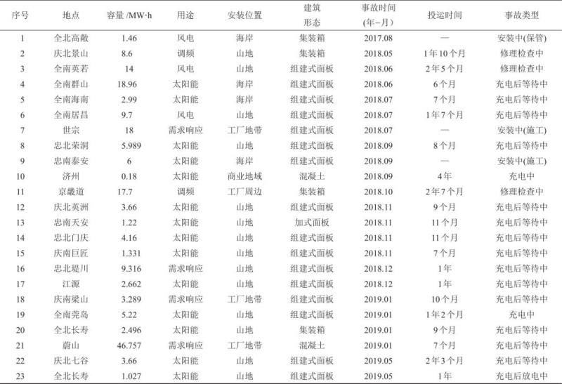 近三年來,國內外鋰電池儲能系統(tǒng)裝機增長迅速,據中關村儲能產業(yè)技術聯(lián)盟(China Energy Storage Alliance,CNESA)統(tǒng)計,僅2017—2018年間電化學儲能裝機由2926.6 GW增長至6625.4 GW,年增幅126.4%。其中,韓國鋰電儲能在其可再生能源證書獎勵政策激勵之下迅速發(fā)展,2018年全球新增電化學儲能裝機中,韓國幾乎占據全球45%。然而,韓國儲能電站發(fā)生火災安全事故的數量和比率也處于全球首位。2017—2019年期間,報道的韓國儲能電站事故已近30起。對此,韓國組織相關電池廠家及研究機構對2019年6月前其境內23起儲能安全事故開展了調查及分析,表1匯總了2019年6月前韓國儲能事故情況。