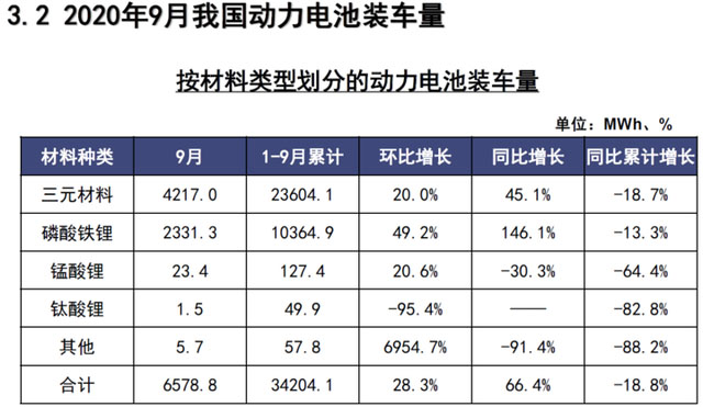 前9月,我國動力電池裝車量累計34.2GWh,同比累計下降18.8%,降幅進一步縮窄。其中三元電池裝車量累計23.6GWh,占總裝車量69.0%,同比累計下降18.7%;磷酸鐵鋰電池裝車量累計10.4GWh,占總裝車量30.3%,同比累計下降13.3%。