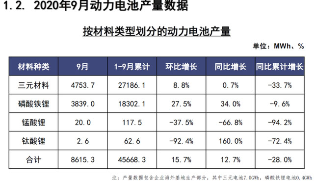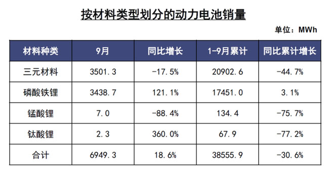 9月,我國動力電池銷量共計6.9GWhGWh,同比增長18.6%。其中三元電池銷售3.5GWh,同比下降17.5%,占總銷量50.4%;磷酸鐵鋰電池銷售3.4GWhGWh,同比增長121.1%,占總銷量49.5%。