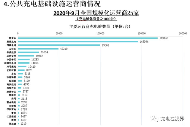 截止到2020年9月,全國(guó)充電運(yùn)營(yíng)企業(yè)所運(yùn)營(yíng)充電樁數(shù)量超過1萬(wàn)臺(tái)的共有9家,分別為:特來(lái)電運(yùn)營(yíng)16.9萬(wàn)臺(tái)、星星充電運(yùn)營(yíng)14.5萬(wàn)臺(tái)、國(guó)家電網(wǎng)運(yùn)營(yíng)10萬(wàn)臺(tái)、云快充運(yùn)營(yíng)4.9萬(wàn)臺(tái)、依威能源運(yùn)營(yíng)2.6萬(wàn)臺(tái)、上汽安悅運(yùn)營(yíng)2萬(wàn)臺(tái)、中國(guó)普天運(yùn)營(yíng)1.4萬(wàn)臺(tái)、深圳車電網(wǎng)運(yùn)營(yíng)1.4萬(wàn)臺(tái)、萬(wàn)馬愛充運(yùn)營(yíng)1萬(wàn)臺(tái)。這9家運(yùn)營(yíng)商占總量的90.3%,其余的運(yùn)營(yíng)商占總量的9.7%。