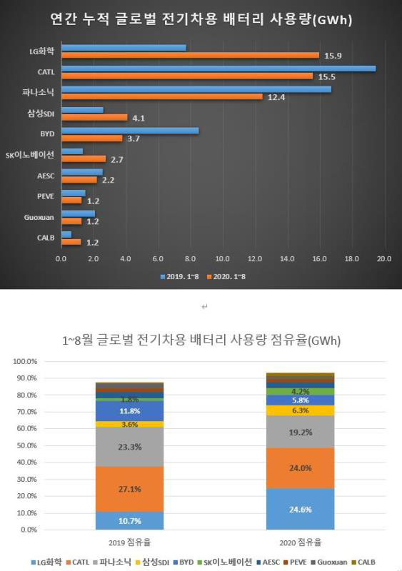 根據(jù)韓國調(diào)查機(jī)構(gòu)SNE Research的數(shù)據(jù),2020年1-8月全球動(dòng)力電池使用量較去年同期萎縮9.9%至64.7GWh,其中LG化學(xué)以24.6%(15.9GWh)的市占率居冠,寧德時(shí)代以24%(15.54GWh)的市占率緊追在后,松下以19.2%的市占率排第三,韓國三星SDI(6.3%)、比亞迪(5.8%)和韓國SK Innovation(4.2%)則順列第四至第六位。