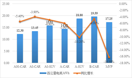 將新能源乘用車劃分為A00-CAR、A0-CAR、A0-SUV、A-CAR、A-SUV、B-CAR以及MVP等7個(gè)車輛類型對(duì)其百公里電耗進(jìn)行分析可知,百公里耗電均值為15.95千瓦時(shí),較2018年降低7.31%,目標(biāo)完成略有壓力。具體表現(xiàn)如下:A00-CAR車型百公里耗電為12.30千瓦時(shí),為新能源乘用車百公里耗電最低的車型,同比去年降低5.40%;A0-CAR車型百公里耗電為13.45千瓦時(shí),同比降低3.90%;A0-SUV車型百公里耗電為15.81千瓦時(shí),同比降低4.90%;A-CAR車型百公里耗電為14.42千瓦時(shí),同比降低5.90%;A-SUV車型百公里耗電為18.80千瓦時(shí),降低10.20%;B-CAR車型為百公里耗電達(dá)19.59千瓦時(shí),同比降低4.60%;MVP車型百公里電耗同比降速為17.25%,達(dá)17.25千瓦時(shí),為百公里電耗最大降速車型(如圖1所示)。目前,終端消費(fèi)市場(chǎng)以A0-SUV、A-CAR和A-SUV等為主,但其百公里電耗遠(yuǎn)高于2025年12千瓦時(shí)的目標(biāo)值,為此,亟需在提高單體電池能量密度、加強(qiáng)系統(tǒng)集成技術(shù)方案及提升市場(chǎng)競(jìng)爭(zhēng)從而淘汰落后產(chǎn)能企業(yè)等方面努力。