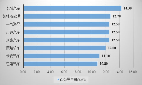 選取A00-CAR典型企業(yè)分析百公里耗電可知其分布范圍為10.80kWh~14.30kWh,其中,長(zhǎng)城汽車百公里耗電最高,江淮汽車百公里耗電最低(如圖2所示),最低值與最高值相差3.5千瓦時(shí),企業(yè)之間差距較大。