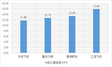 對(duì)于A0-CAR車型,選取長(zhǎng)安汽車、重慶力帆、康迪轎車、江淮汽車作為典型企業(yè),可知江淮汽車百公里耗電最高,達(dá)15.90kWh,長(zhǎng)安汽車百公里耗電最低,為11.80kWh,兩者相差4.1千瓦時(shí)(如圖3所示)。