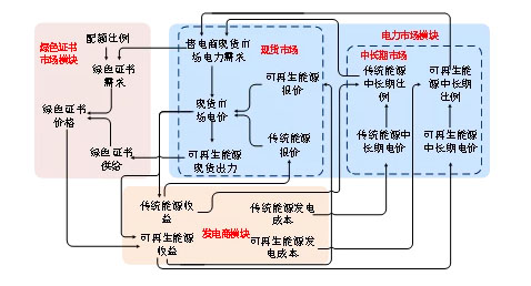 2、搭建了包括可再生能源電力中長期合約交易、傳統(tǒng)能源中長期合約交易、電力現(xiàn)貨交易的電力市場與綠色證書市場等相互耦合模塊的系統(tǒng)動力學模型,主擬分析了可再生能源發(fā)電商在電力中長期以及綠色證書市場中的交易情況。