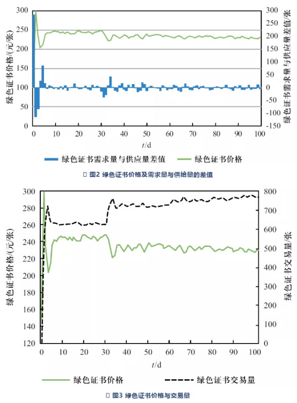 從圖3中可以看出,除了第一日可再生能源發(fā)電商無證書進行交易,之后綠色證書的實際交易量與綠色證書價格整體呈負相關:當綠色證書價格下降時交易量會有所增加。每30天綠色證書的交易量都有會有階躍式增加,這是由于可再生能源發(fā)電商與售電商簽訂的中長期合約比例減少,售電商為了完成配額義務,在綠證市場中的證書購買量會有所增加。