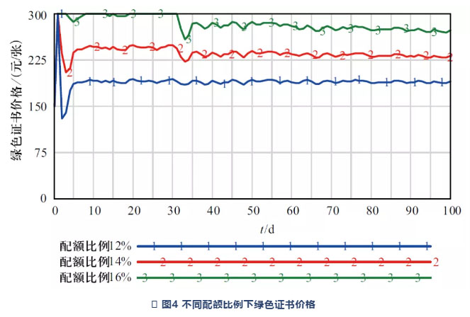當配額比例發(fā)生變化時,售電商對可再生能源電力和綠色證書的需求會隨之變化,當配額比例分別調整為12%和16%時,綠色證書市場的交易價格情況也會發(fā)生變化,如圖4所示。從圖中可以看出:①三種配額比例下,初始時刻由于無綠證供應導致綠證價格激增至峰值,配額比例越小,售電商對綠證的需求越少,供需量相差越大,使得第二日的綠色證書價格回落幅度越大。②三種配額比例下,綠色證書的價格均會趨向一個均衡值,且配額比例越高,均衡值越大。這是由于配額比例越高,售電商對于綠證的實際需求量越大,從而抬升了證書價格。
