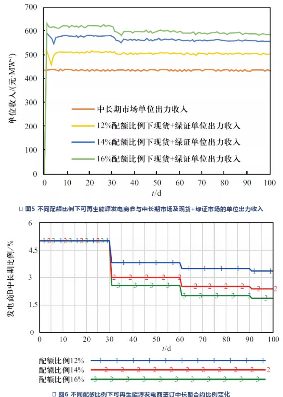 仿真結果表明,綠色證書市場中的價格和交易量受供需影響,會處于波動狀態(tài),最終趨向一個均衡值??稍偕茉窗l(fā)電商在現(xiàn)貨市場和綠色證書市場中的單位收入高于在中長期市場中的單位收入,因此,在中長期合約價格保持不變的情況下,可再生能源發(fā)電商更傾向于同時參與現(xiàn)貨市場和綠色證書市場,降低中長期合約的比例。這為可再生能源發(fā)電商進行策略調整提供了一定參考。
