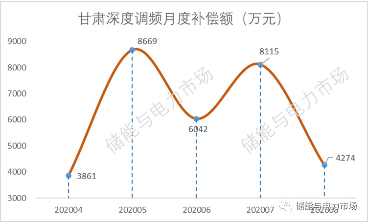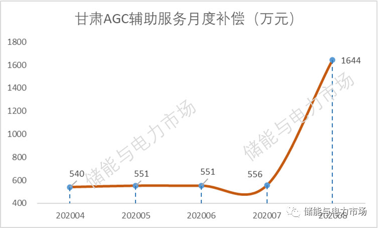 從數(shù)據(jù)上看,甘肅省的AGC月度補(bǔ)償額度不大,基本位于500萬左右。但2020年8月份出現(xiàn)了一次大的提升,較2020年7月份556萬增加了195.82%,達(dá)到1664萬元。