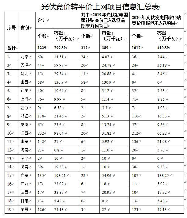 根據(jù)《國(guó)家能源局綜合司關(guān)于報(bào)送光伏競(jìng)價(jià)轉(zhuǎn)平價(jià)上網(wǎng)項(xiàng)目的通知》要求,結(jié)合各省級(jí)能源主管部門報(bào)送項(xiàng)目信息,光伏競(jìng)價(jià)轉(zhuǎn)平價(jià)上網(wǎng)項(xiàng)目共1229個(gè)、裝機(jī)規(guī)模799.89萬(wàn)千瓦,現(xiàn)予公布。