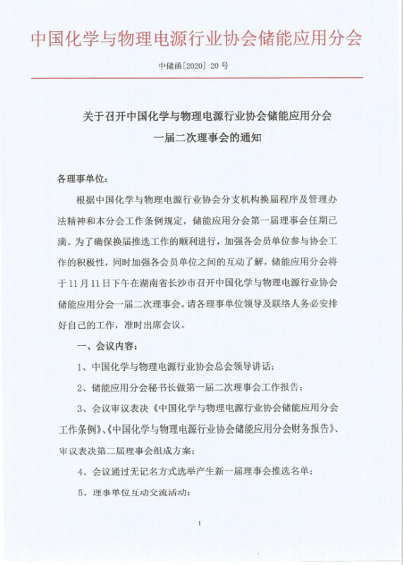 關(guān)于召開中國(guó)化學(xué)與物理電源行業(yè)協(xié)會(huì)儲(chǔ)能應(yīng)用分會(huì)一屆二次理事會(huì)的通知