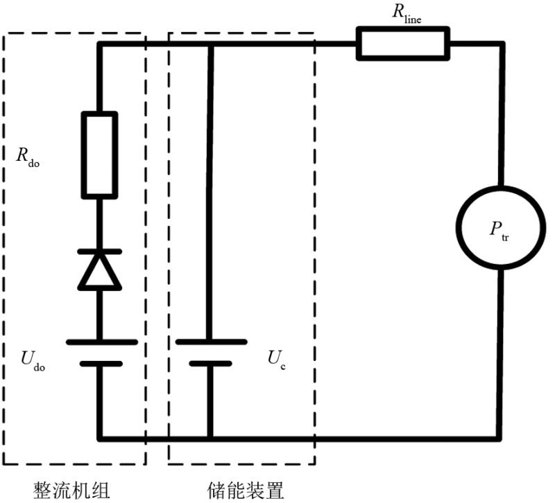 建立列車、整流機(jī)組和儲(chǔ)能裝置的電氣模型,如圖3所示。整流機(jī)組的模型為電壓源與電阻的串聯(lián),考慮到整流器僅具備單向變流能力,模型中需要串入二極管以防止整流機(jī)組電流反向,Ud0為整流機(jī)組的空載電壓,Rd0為等效內(nèi)阻。列車的模型為功率源,功率的大小由列車的運(yùn)行狀態(tài)決定,根據(jù)牽引計(jì)算過(guò)程得到。儲(chǔ)能裝置的模型為電壓源,Uc為穩(wěn)壓值,當(dāng)超級(jí)電容充電時(shí)穩(wěn)壓值需高于空載電壓且低于系統(tǒng)允許最高電壓,當(dāng)超級(jí)電容放電時(shí)穩(wěn)壓值需低于空載電壓且高于系統(tǒng)允許最低電壓。Rline為牽引網(wǎng)的線路電阻,由單位長(zhǎng)度阻抗和線路長(zhǎng)度決定。