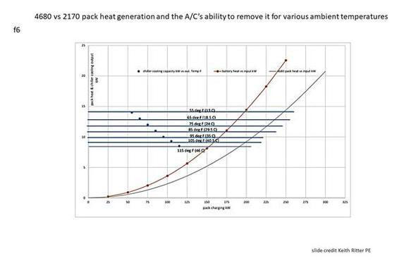 而在最大充電功率方面,4680電池組從2170電池組的250 kW增加到275 kW,其中逐漸降低充電功率時,275 kW的充電功率在10%-50%的充電狀態(tài)下保持恒定。而當電池組達到以Model X數(shù)據設定的45攝氏度溫度極限時,我們便開始逐漸降低充電功率。這是因為較高的環(huán)境溫度下,空調系統(tǒng)的性能會降低,降低充電功率點是環(huán)境溫度的函數(shù)。