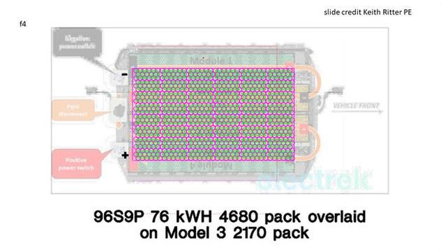 76 kWh 4680電池組尺寸(估算)同比例對照Model 3現(xiàn)有2170電池組
