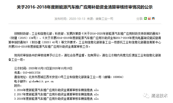 工信部2020年10月13日發(fā)布:關(guān)于2016-2018年度,新能源汽車推廣應(yīng)用補(bǔ)助資金清算審核終審情況的公示。公示內(nèi)容如下截圖: