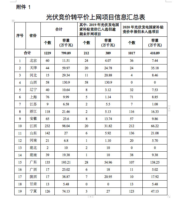附件:1. 光伏競價轉平價上網項目信息匯總表