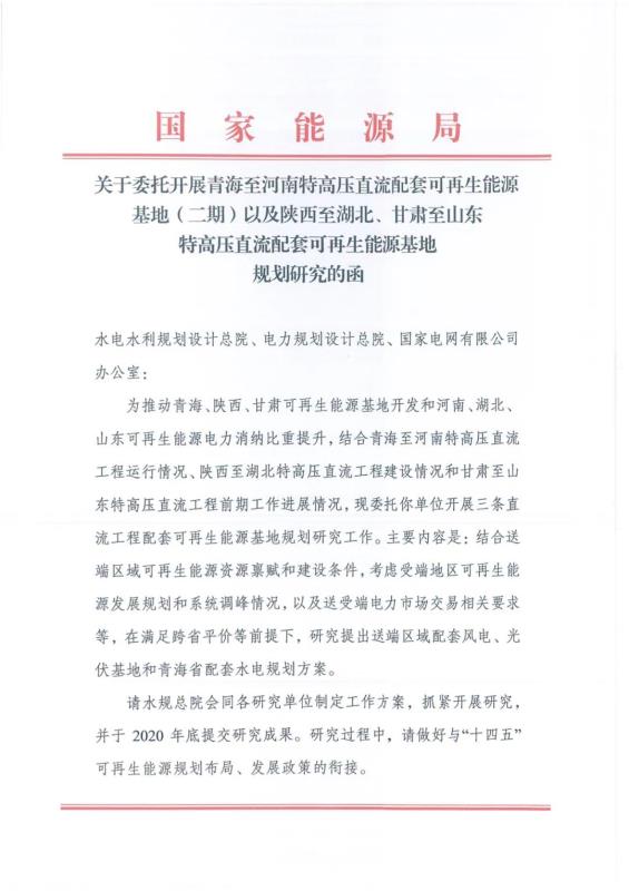 近日,光伏們獲悉,國家能源局發(fā)函委托水電總院、電規(guī)總院以及國家電網(wǎng)對青海至河南特高壓直流配套可再生能源基地(二期)、陜西至湖北、甘肅至山東特高壓直流配套可再生能源基地進(jìn)行規(guī)劃研究。根據(jù)文件,三大基地規(guī)劃方案將于2020年底提交。