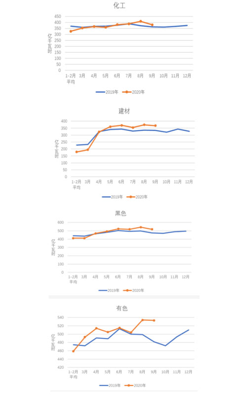 1-9月,化工行業(yè)用電量3314億千瓦時(shí),同比下降0.6%,增速比上年同期回落1.5個(gè)百分點(diǎn);建材行業(yè)用電量2728億千瓦時(shí),同比增長(zhǎng)0.9%,增速比上年同期回落4.9個(gè)百分點(diǎn);黑色金屬冶煉行業(yè)用電量4329億千瓦時(shí),同比增長(zhǎng)2.2%,增速比上年同期回落3.5個(gè)百分點(diǎn);有色金屬冶煉行業(yè)用電量4531億千瓦時(shí),同比增長(zhǎng)3.4%,增速比上年同期提高3.6個(gè)百分點(diǎn)。