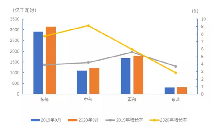1-9月,東、中、西部和東北地區(qū)②全社會(huì)用電量分別為25636、10163、15262和3073億千瓦時(shí),增速分別為0.4%、-0.4%、4.2%和0.6%。
