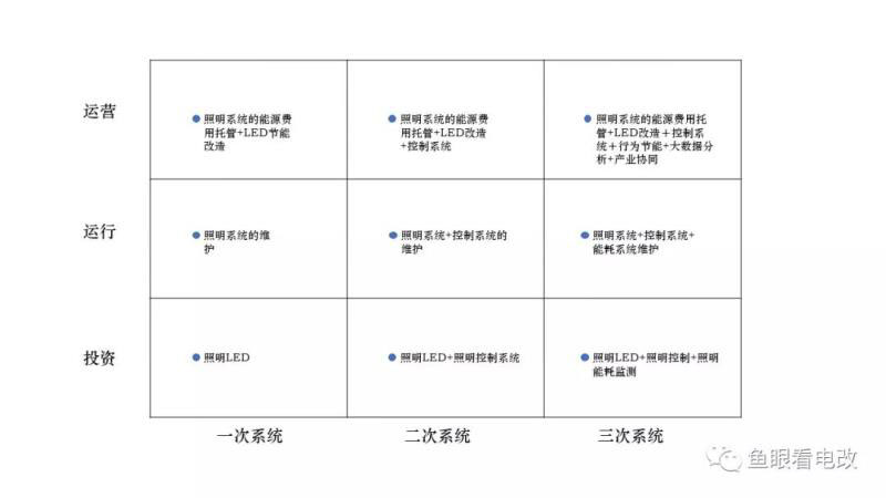只有到了運(yùn)營(yíng)這個(gè)層面,真正的客戶價(jià)值才能體現(xiàn)出來(lái),節(jié)能價(jià)值才和能源收益密切掛鉤,徹底擺脫了投資方、業(yè)主、使用方三者利益不一致導(dǎo)致的問(wèn)題:LED燈很節(jié)能,但是用的人不付電費(fèi)不關(guān)燈,付電費(fèi)的人不知道怎么在用,投資的人只管按照節(jié)能量分成。甚至出現(xiàn)用的越多,節(jié)約量越多,分成越多的怪圈。