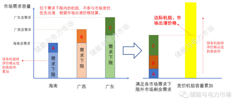 左圖中,滿足各區(qū)域市場容量需求下限內(nèi)的機組,不參與市場競爭,將優(yōu)先提供服務(wù),結(jié)算價格由市場出清價格決定。