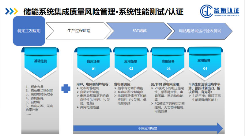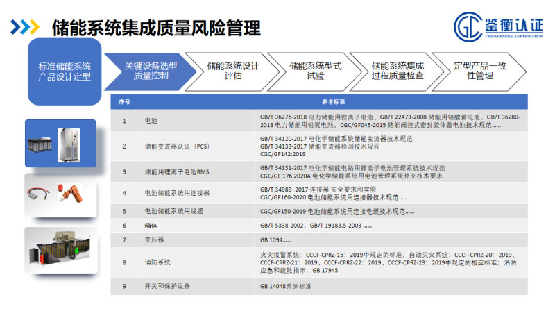 首先在一個標(biāo)準(zhǔn)化的產(chǎn)品中,我們在設(shè)備選型環(huán)節(jié)中,建議大家選擇有標(biāo)準(zhǔn)可依據(jù)的,并且滿足認(rèn)證要求的一些產(chǎn)品,鑒衡針對一些尚缺乏國標(biāo)的產(chǎn)品,我們也推出了自己的技術(shù)規(guī)范。這些年在電池、電池管理系統(tǒng)、PCS、電線電纜、連接器等關(guān)鍵零部件,鑒衡也做了很多產(chǎn)品檢測和認(rèn)證業(yè)務(wù),也就是市場上已經(jīng)有這樣可以滿足相應(yīng)國標(biāo),符合相應(yīng)認(rèn)證規(guī)則的產(chǎn)品存在,推薦大家更多去選擇這樣的產(chǎn)品,可能對于我們整個系統(tǒng)的質(zhì)量風(fēng)險管控會起到很好的效果。第二個就是我們應(yīng)該關(guān)注設(shè)計評估的過程,建議關(guān)注設(shè)計準(zhǔn)則、控制程序、電氣及機械結(jié)構(gòu)設(shè)計等,還應(yīng)該包括制造過程、吊裝、運輸、運行維護(hù)等過程設(shè)計,設(shè)計評估可以解決很多產(chǎn)品檢驗不能了解到的產(chǎn)品技術(shù)特點和水平。