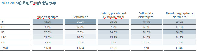 其地理來(lái)源的分布與電池非常相似。日本是明顯的領(lǐng)先者,在2000年至2018年公布的所有IPF中,日本幾乎占了50%。它的主導(dǎo)地位在于其在靜電超級(jí)電容器領(lǐng)域的地位,在該領(lǐng)域,它產(chǎn)生了近三分之二的ipf。美國(guó)以18.2%的市場(chǎng)份額排名第二,這得益于美國(guó)在混合、贗電、電化學(xué)超級(jí)電容器、固態(tài)電解質(zhì)和納米管/石墨烯電極超級(jí)電容器領(lǐng)域的強(qiáng)勢(shì)地位。歐洲超級(jí)電容器市場(chǎng)份額為13.6%,其中混合、贗電、電化學(xué)超級(jí)電容器市場(chǎng)份額最高。