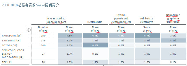 前五名申請(qǐng)者僅占超級(jí)電容器相關(guān)IPF的13.5%,突顯出這一快速增長(zhǎng)的技術(shù)領(lǐng)域創(chuàng)新集中度較低。在這些申請(qǐng)者中,有4家總部位于日本,1家位于韓國(guó),松下公司居首,三星和豐田緊隨其后。豐田將其創(chuàng)新活動(dòng)集中在靜電超級(jí)電容器上,這是一個(gè)更為成熟的技術(shù)領(lǐng)域,而松下在混合動(dòng)力、贗電容器和電化學(xué)超級(jí)電容器方面占據(jù)著強(qiáng)勢(shì)地位。三星在采用納米管和石墨烯電極的超級(jí)電容器領(lǐng)域處于領(lǐng)先地位。