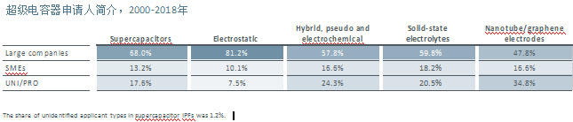 靜電超級(jí)電容器是一個(gè)由大公司主導(dǎo)的類(lèi)別,占所有IPF的81.2%,除此之外,超級(jí)電容器中相對(duì)較大的創(chuàng)新份額來(lái)自中小企業(yè)和公共研究機(jī)構(gòu)。這證實(shí)了超級(jí)電容器是另一個(gè)充滿(mǎn)活力的新興領(lǐng)域儲(chǔ)藏室。差不多了在混合、贗電容器領(lǐng)域,25%的IPF由大學(xué)和公共研究機(jī)構(gòu)產(chǎn)生,超級(jí)電容器用納米管/石墨烯電極的比例升至34.8%。