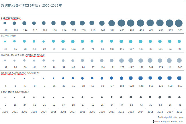 21世紀(jì)初,超級(jí)電容器的技術(shù)有了重大發(fā)展,每年產(chǎn)生約100個(gè)IPFs,到2017年,這個(gè)數(shù)字已經(jīng)增加到每年超過(guò)500個(gè)IPFs。早期的開(kāi)發(fā)主要集中在雙層靜電超級(jí)電容器,以及混合、偽和電化學(xué)超級(jí)電容器。意見(jiàn)的相對(duì)吸引力這些類(lèi)型的超級(jí)電容器出現(xiàn)分化,然而,剩下的ipf靜電超級(jí)電容器在停滯不前水平自2006年以來(lái),技術(shù)的改進(jìn)混合,贗電容器導(dǎo)致ipf的增加,2018年達(dá)到每年200。在超級(jí)電容器中使用納米管和石墨烯電極是過(guò)去20年來(lái)該領(lǐng)域另一個(gè)不斷增長(zhǎng)的創(chuàng)新領(lǐng)域,記錄的ipf數(shù)量從21世紀(jì)初的幾乎為零上升到2018年的169個(gè)。與電池不同,用于超級(jí)電容器的固態(tài)電解質(zhì)的研發(fā)并沒(méi)有增加,自2013年以來(lái)ipf的數(shù)量一直徘徊在50個(gè)左右。