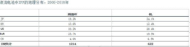 在此背景下,與液流電池相關(guān)的IPFs的地理分布與鋰離子相關(guān)IPFs的地理分布顯著不同。美國(guó)是主導(dǎo)創(chuàng)新中心,2000-2018年,美國(guó)創(chuàng)新中心的IPFs數(shù)量占該領(lǐng)域創(chuàng)新中心總量的近三分之一,其次是歐洲,占23.7%。日本以19.2%的IPFs排名第三。