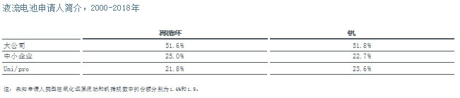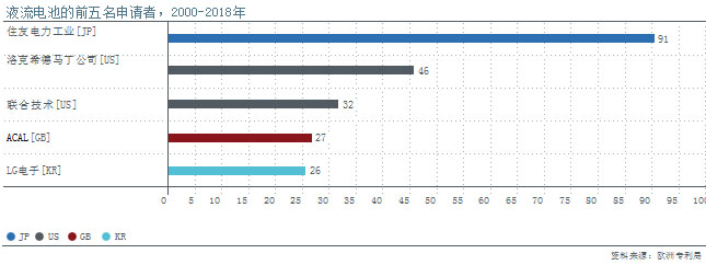 中小企業(yè)、大學(xué)和公共研究機(jī)構(gòu)在發(fā)展液流技術(shù)方面仍扮演重要角色。在2000年至2018年期間,它們占該領(lǐng)域所有IPF的近一半,這是一個(gè)動(dòng)態(tài)和新興技術(shù)領(lǐng)域的典型趨勢(shì)。綜合來(lái)看,前五名申請(qǐng)者在該領(lǐng)域的IPFs份額(18%)明顯低于電池領(lǐng)域的整體份額(28%)。日本住友電氣工業(yè)公司遙遙領(lǐng)先,緊隨其后的是兩家美國(guó)航空航天公司洛克希德·馬丁公司和聯(lián)合科技公司,以及一家只在該領(lǐng)域運(yùn)營(yíng)的較小的英國(guó)公司Acal Energy。LG電子在榜單上排名第五,是唯一一家在所有電池技術(shù)領(lǐng)域進(jìn)入前十的公司。