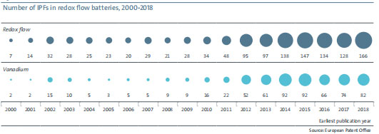 液流電池的創(chuàng)新直到最近才在專(zhuān)利申請(qǐng)中顯現(xiàn)出來(lái)。 2012年,這一領(lǐng)域的指規(guī)數(shù)幾乎翻了一番,到2018年達(dá)到166個(gè)。液流電池可以有不同的化學(xué)成分,釩是最常用的氧化還原活性陽(yáng)離子。 這也可以在專(zhuān)利數(shù)據(jù)中看到。