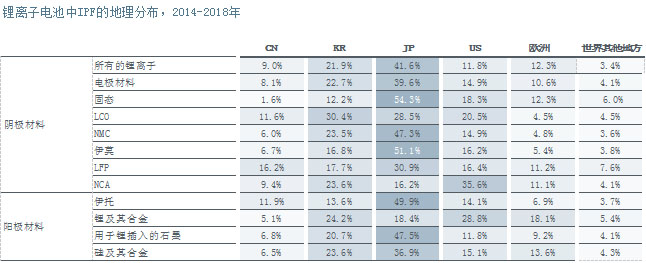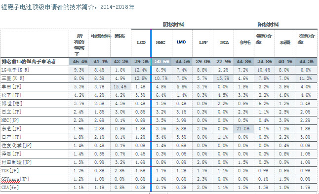 綜上所述,2014-2018年鋰離子電池領(lǐng)域前15名申請(qǐng)者在電極材料和固態(tài)電池相關(guān)IPFs中所占的份額略低于鋰離子技術(shù)相關(guān)的總體份額(表7.2)。然而,各子領(lǐng)域申請(qǐng)者的份額差異較大,特別是陰極材料,主要化學(xué)領(lǐng)域如NMC(50.6%)和LMO(44.5%)中IPFs的累積份額較高,新興領(lǐng)域如NCA(27.9%)和LFP(29%)中IPFs的累積份額相對(duì)較小。這種模式很常見(jiàn),說(shuō)明新興領(lǐng)域更容易吸引新入者和新競(jìng)爭(zhēng)。