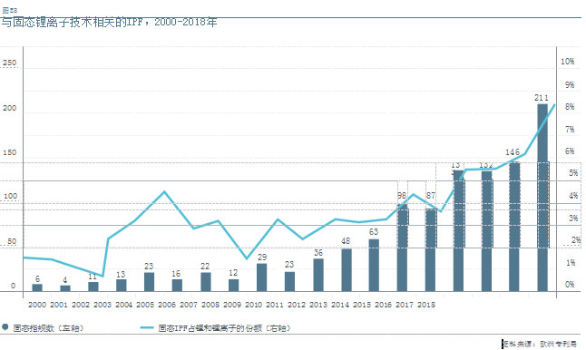 固態(tài)電解質(zhì)是專(zhuān)利活動(dòng)的另一個(gè)主要領(lǐng)域,在這一領(lǐng)域,專(zhuān)利活動(dòng)在不斷增長(zhǎng),自2010年以來(lái),專(zhuān)利活動(dòng)平均每年增長(zhǎng)25%。2018年,尋找下一代鋰離子電池的新趨勢(shì)占所有專(zhuān)利活動(dòng)的8%以上。電解質(zhì)是鋰離子技術(shù)發(fā)明的焦點(diǎn),而2010年這一比例為3%。目前,正在努力尋找替代品,以期找到替代品,以解決現(xiàn)有設(shè)備中現(xiàn)有鋰離子電池(包括低鋰離子電池)中使用的液體或聚合物凝膠電解質(zhì)的一些缺點(diǎn),這些缺點(diǎn)會(huì)帶來(lái)易燃性風(fēng)險(xiǎn)。固態(tài)電導(dǎo)率高,在電解質(zhì)/電解質(zhì)上的接觸電阻高,具有較高的能量比和電極界面,但目前材料價(jià)格昂貴。預(yù)計(jì)未來(lái)十年,固態(tài)電解質(zhì)將在電動(dòng)汽車(chē)上得到商業(yè)應(yīng)用,并可能產(chǎn)生溢出效應(yīng),這將有助于使這些電池在其他應(yīng)用中具有競(jìng)爭(zhēng)力。