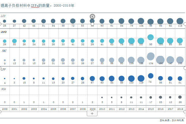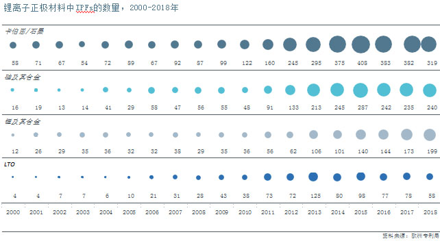自2000年以來(lái),與鋰離子電池電極(正極和負(fù)極)材料有關(guān)的IPFs數(shù)量一直以幾乎穩(wěn)定的速度增加。2010年至2013年期間出現(xiàn)了極快的增長(zhǎng)期,期間指規(guī)數(shù)從355個(gè)增加到近900個(gè)。在2018年,大約40%的鋰離子IPF與電極的創(chuàng)新有關(guān)。