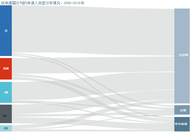 對(duì)申請(qǐng)人特征的進(jìn)一步分析也揭示了亞洲國(guó)家之間以及美國(guó)和歐洲之間的一些差異。日本和韓國(guó)的創(chuàng)新活動(dòng)主要由大公司或非常大的公司進(jìn)行,小公司(日本為3.4%,韓國(guó)為4.6%)和大學(xué)或研究機(jī)構(gòu)(日本為3.5%,韓國(guó)為9.0%)提供了相對(duì)較小的創(chuàng)新活動(dòng)。相比之下,美國(guó)中小企業(yè)和大學(xué)的貢獻(xiàn)要大得多(分別為34.4%和13.8%)。歐洲國(guó)家也是如此,盡管程度較低,中小企業(yè)占15.9%,大學(xué)和公共研究機(jī)構(gòu)占12.7%。因此,歐洲國(guó)家是SME和大學(xué)的第二大IPF來(lái)源國(guó),僅次于美國(guó),盡管與電池相關(guān)的IPF數(shù)量?jī)H排在第四位。