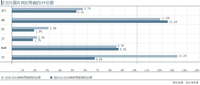 相比之下,隨著中國(guó)電池創(chuàng)新的迅速崛起,中國(guó)涉及外國(guó)共同發(fā)明者的ipf數(shù)量急劇下降(從13.2%降至6.6%)。這可能是由于中國(guó)的創(chuàng)新越來(lái)越少地依賴(lài)外國(guó)支持,以及中國(guó)越來(lái)越多的專(zhuān)業(yè)知識(shí)和對(duì)本土發(fā)明的依賴(lài)。同樣韓國(guó)的外國(guó)共同發(fā)明人比例從2.9%降至1.8%,日本從2.0%降至1.7%。
