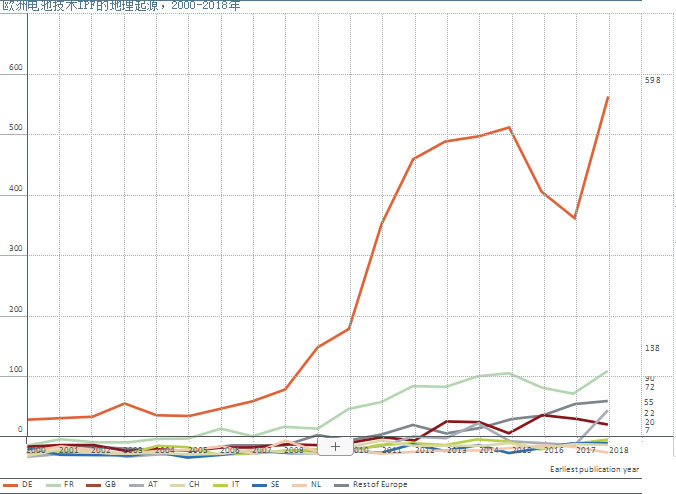 在歐洲,電池技術(shù)創(chuàng)新主要由德國(guó)主導(dǎo),在2008-2012年,德國(guó)大幅提高了其領(lǐng)先于其他歐洲國(guó)家的優(yōu)勢(shì)。在2000年至2018年期間,僅德國(guó)就占了來(lái)自歐洲的指規(guī)數(shù)的一半以上,在前25個(gè)電池申請(qǐng)企業(yè)中,5個(gè)歐洲實(shí)體中有4個(gè)來(lái)自德國(guó)。法國(guó)是歐洲第二大最具創(chuàng)新能力的國(guó)家,2000-2018年與電池相關(guān)的IPFs占不到1%,前25名中只有一個(gè)實(shí)體(CEA)。