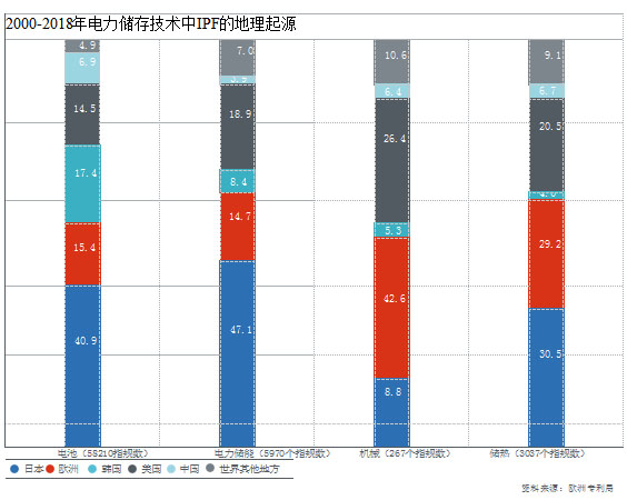 剩下的兩類(lèi)蓄電技術(shù)—熱力蓄電和機(jī)械蓄電技術(shù)—分別只占與蓄電有關(guān)的所有IPFS的5%和3%。機(jī)械能存儲(chǔ)結(jié)合了幾種存儲(chǔ)原理,如抽水蓄能,壓縮空氣,飛輪儲(chǔ)能和蓄冷。機(jī)械存儲(chǔ)和儲(chǔ)熱的主要原理眾所周知,相對(duì)于電池和電存儲(chǔ)解決方案,相應(yīng)領(lǐng)域的技術(shù)相對(duì)成熟。因此,這些領(lǐng)域的技術(shù)進(jìn)展主要是漸進(jìn)式革新,這可以解釋文件所記錄的IPF數(shù)量相對(duì)較少的原因。