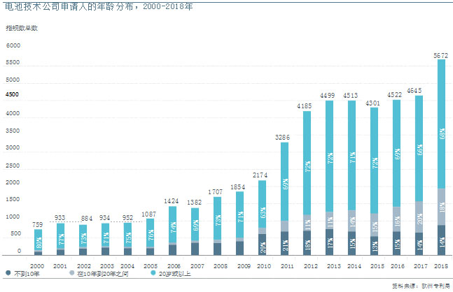 因此,電池組的專(zhuān)利活動(dòng)為創(chuàng)新者在這一領(lǐng)域的目標(biāo)應(yīng)用提供了見(jiàn)解。 近年來(lái),電池包的專(zhuān)利活動(dòng)的增長(zhǎng)速度快于電池。 這表明技術(shù)的成熟程度,因?yàn)槿藗兊淖⒁饬σ褟倪@項(xiàng)技術(shù)背后的基礎(chǔ)科學(xué)轉(zhuǎn)向如何優(yōu)化其交付,以滿(mǎn)足高要求的商業(yè)市場(chǎng)。