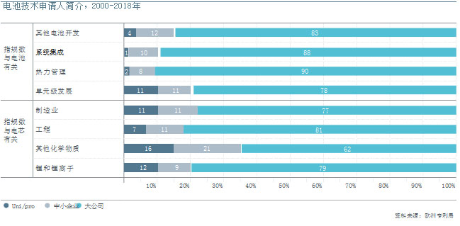 申請(qǐng)人的簡(jiǎn)介在電池技術(shù)的各個(gè)子領(lǐng)域之間也有很大差異。 中小企業(yè)和大學(xué)在與電池應(yīng)用更密切相關(guān)的領(lǐng)域的比例要低得多,例如集成和熱管理。 相反,它們的貢獻(xiàn)在源頭創(chuàng)新方面更高,特別是在鋰離子的替代化學(xué)物質(zhì)方面。 在這一領(lǐng)域,大學(xué)占知識(shí)產(chǎn)權(quán)框架的21%,中小企業(yè)占16%。