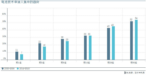 自2000年以來(lái),排名前25位的申請(qǐng)者在所有與電池相關(guān)的ipf中所占比例略低于一半(47%)。這一比例在過(guò)去五年中略有上升,而前十名申請(qǐng)者的累計(jì)份額也在類(lèi)似程度上下降。這種創(chuàng)新活動(dòng)集中度略有下降的趨勢(shì)是老牌企業(yè)和新企業(yè)之間相互作用的直接結(jié)果:老牌創(chuàng)新者仍保持其重要地位,但在過(guò)去十年中,新興企業(yè)(如LG電子、豐田和博世)的創(chuàng)新迅速增加改進(jìn)電動(dòng)汽車(chē)的電池。這也表明,電池市場(chǎng)仍在增長(zhǎng),行業(yè)尚未達(dá)到成熟時(shí)通??梢杂^察到的集中化趨勢(shì)。