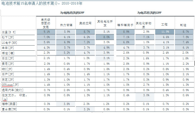 其他公司有更專(zhuān)門(mén)的專(zhuān)利組合。例如,博世的優(yōu)勢(shì)不是在電池層面的發(fā)展,而是在熱管理和集成相關(guān)技術(shù)(電池組)方面。豐田在這些領(lǐng)域擁有類(lèi)似的職位,但在電池制造方面也擁有強(qiáng)大的專(zhuān)利組合。日本公司GS Yuasa和Sumitomo Electric Industries都傾向于專(zhuān)門(mén)從事鋰離子的替代化學(xué)產(chǎn)品。富士康,一家臺(tái)灣公司,在電池電池電池領(lǐng)域沒(méi)有很強(qiáng)的影響力,但在最終應(yīng)用的電池組集成領(lǐng)域顯示出強(qiáng)大的技術(shù)專(zhuān)長(zhǎng)。