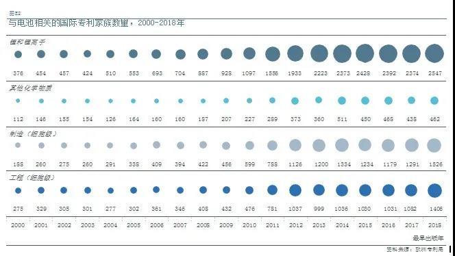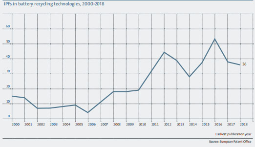 然而,到目前為止,為電池再利用創(chuàng)造價(jià)值鏈的經(jīng)驗(yàn)是稀缺的。新電池制造繼續(xù)享受著強(qiáng)大的規(guī)模經(jīng)濟(jì)效益和整體效率的提高,這不利于對(duì)現(xiàn)有電池進(jìn)行重新利用,而且價(jià)值鏈在技術(shù)上是復(fù)雜的。盡管如此,一個(gè)由原始設(shè)備制造商、電力公司和第三方組成的行業(yè)正在興起,其中還包括一些規(guī)模較小的新興公司。與電池回收相關(guān)的專(zhuān)利行為水平相對(duì)較低,2000年至2018年期間總共只有436個(gè)IPFs。