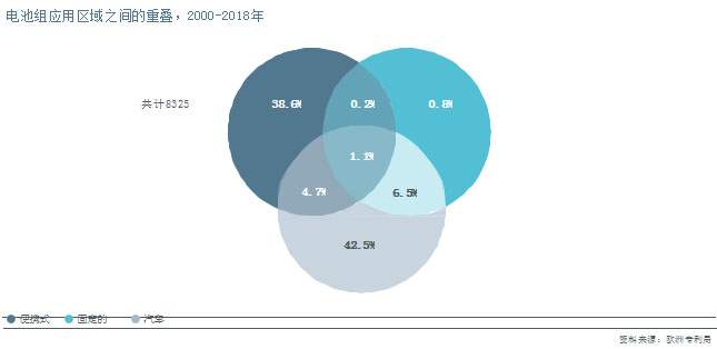 22%與汽車(chē)用電池組相關(guān)的IPF也可用于其他兩個(gè)應(yīng)用領(lǐng)域。雖然汽車(chē)和便攜式應(yīng)用之間的溢出相對(duì)較小,但在汽車(chē)和固定應(yīng)用之間的溢出效應(yīng)尤其強(qiáng)烈,與固定應(yīng)用的電池組相關(guān)的近90%的IPF也與汽車(chē)應(yīng)用相關(guān)。