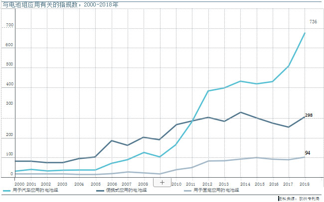 從2000年代中期到2010年,便攜式應(yīng)用程序(通常在消費(fèi)電子產(chǎn)品中)是主要驅(qū)動(dòng)因素。電動(dòng)汽車(chē)的專(zhuān)利在2011年超過(guò)了消費(fèi)電子產(chǎn)品,而便攜式電子電池組設(shè)計(jì)的專(zhuān)利在這一次之后趨于平穩(wěn),電動(dòng)汽車(chē)專(zhuān)利繼續(xù)以更大的活力增長(zhǎng)。